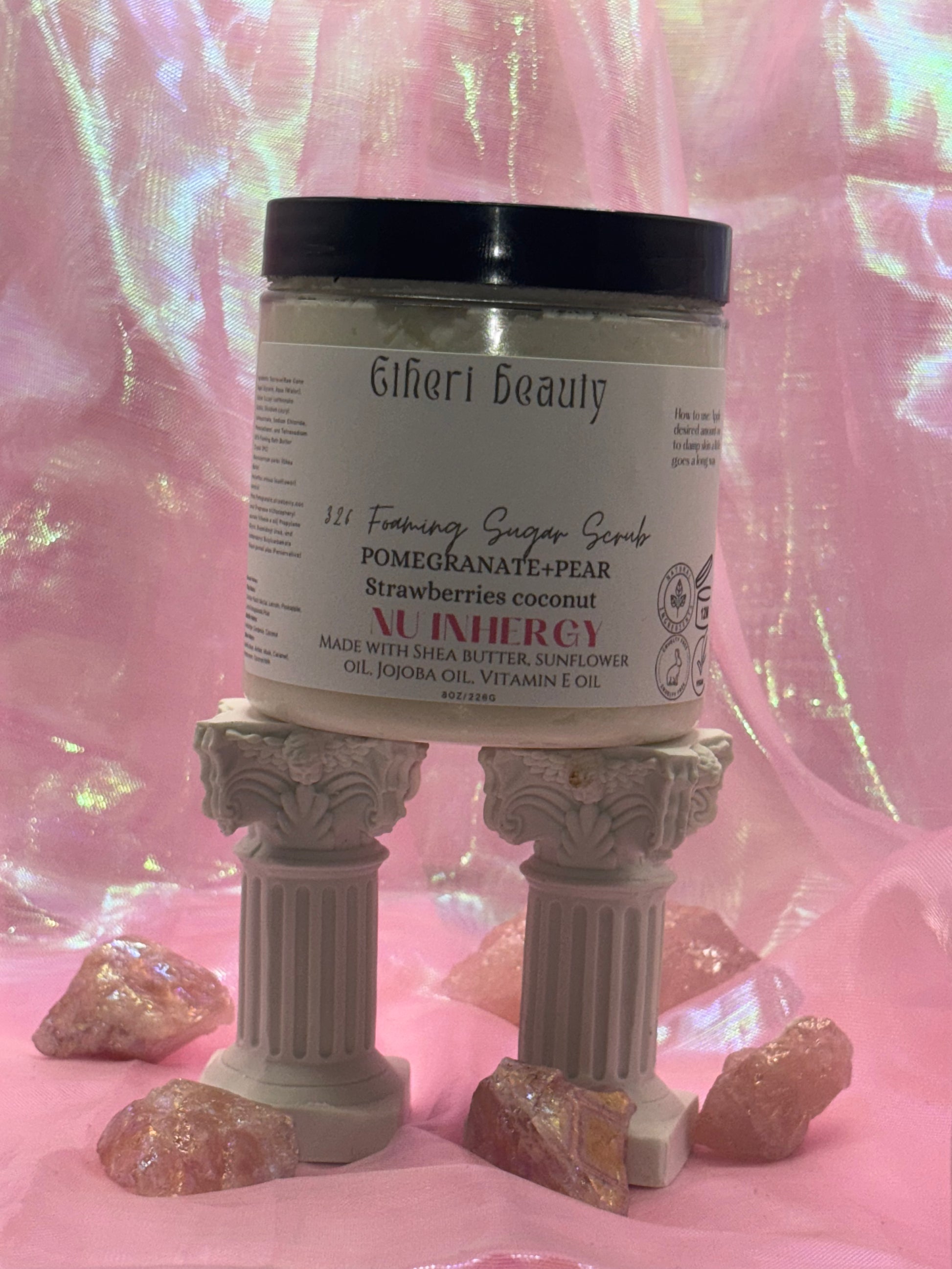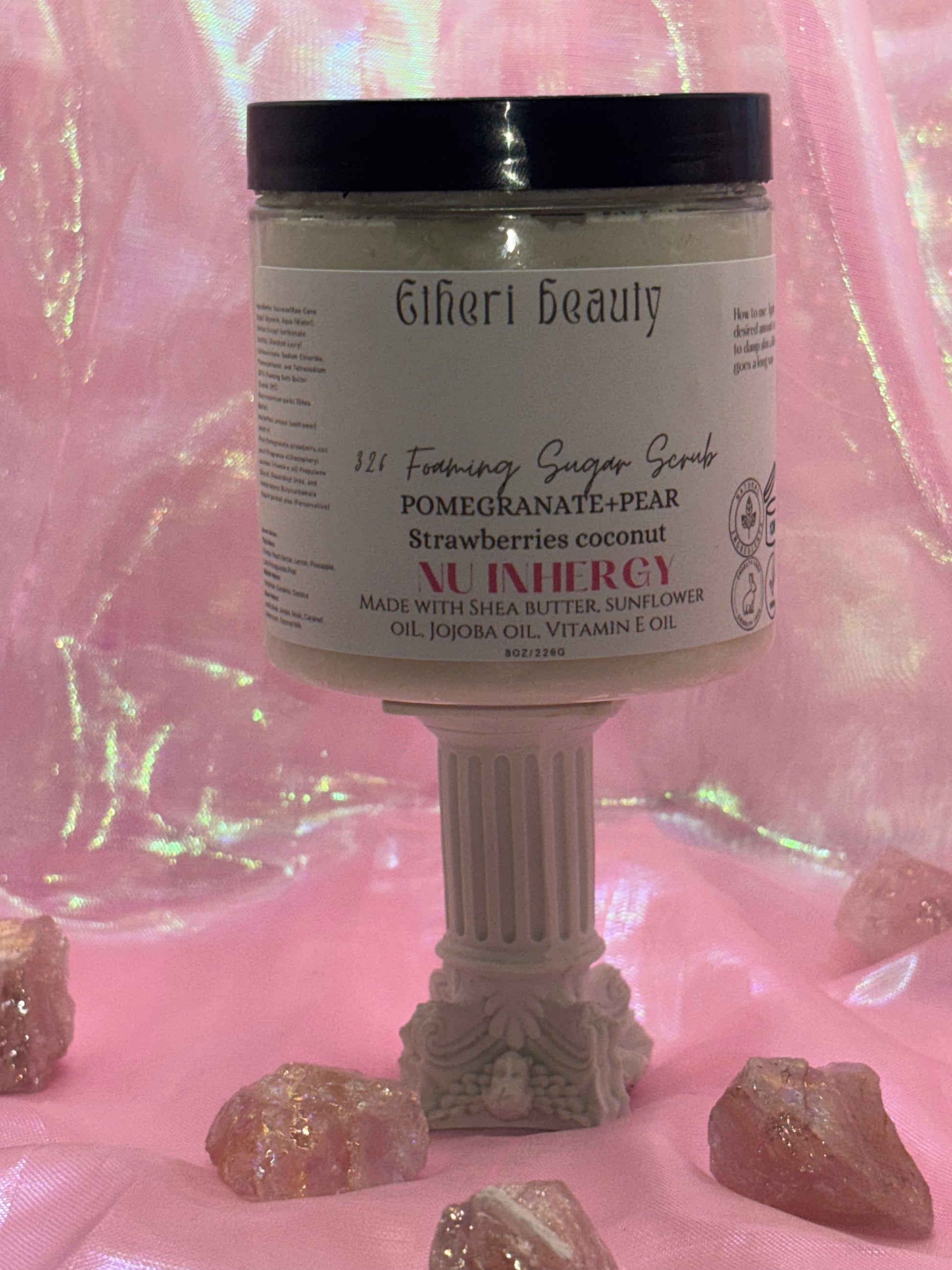 Unleash the power of Nu InHERgy with our 326 Foaming Sugar Scrub! Our unique formula gently exfoliates while providing deep hydration and cleansing. Infused with the delicious scents of pomegranate, pear, coconut, and strawberry, this sugar scrub is a must-have in any self-care routine. Transform your skin into a radiant and refreshed canvas with Nu InHERgy!
